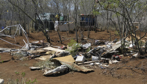 Hunkin walked past a pit bull puppy and peered over a makeshift shelter of tents and tarp hidden by koa haole and elephant grass, then pointed toward the high school’s athletic complex barely a football field away.
