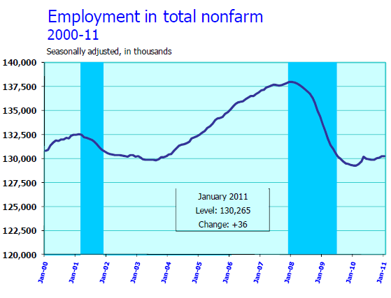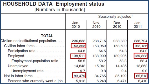 Yet theBureau of Labor Statisticsdata shows that 812,000 jobs were added in the year from January 2010 to January 2011 (138,511,000 vs. 139,323,000). Based on the unemployment rate announced last week, we could expect that those 812,000 additional jobs would have lowered the unemployment rate to near-zero. But of course, we know they didn’t.