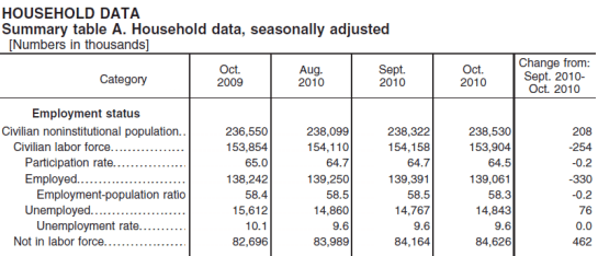 If we take the number of unemployed as roughly 15 million (the BLS number from November 2010) and the true labor force as 160 million (out of anestimated total population of 310 million), then the true unemployment rate would be about 9.4% — right where it was before the recent adjustment to 9%.