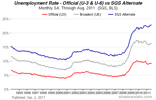 The seasonally-adjusted SGS Alternate Unemployment Rate reflects current unemployment reporting methodology adjusted for SGS-estimated long-term discouraged workers, who were defined out of official existence in 1994. That estimate is added to the BLS estimate of U-6 unemployment, which includes short-term discouraged workers.