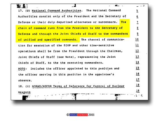 However, on page 99 of the Emergency Alert System for the Joint Chiefs of Staff is irrefutable proof that lawful orders directed through the Chain-of-Command derive their authority at times ONLY from the President.