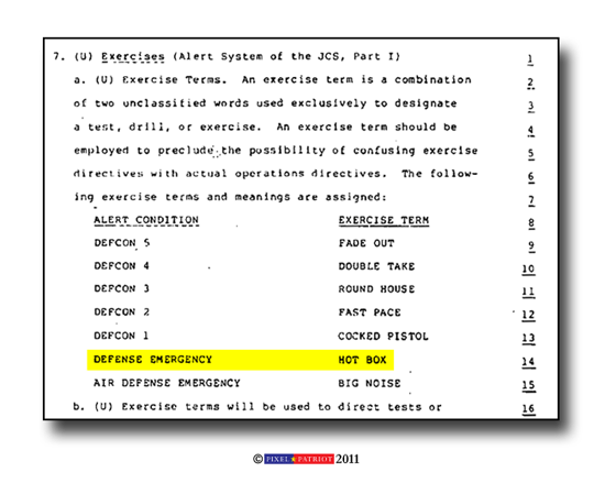 The Defense Emergency condition, or EMERGCON is assigned the code name “HOT BOX”.
