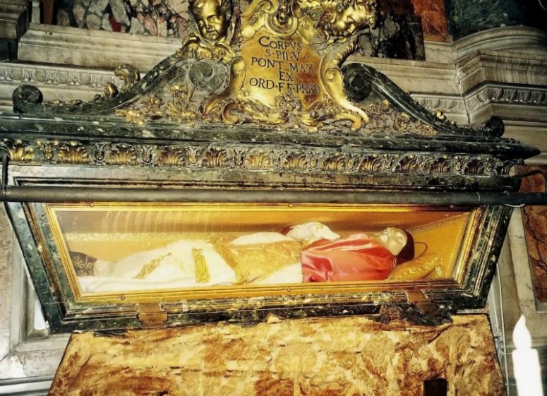 The incorrupt remains of Pope St. Pius V (d. 1572), enshrined in the Basilica of St. Mary Major in Rome.