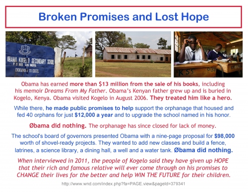If you want to know the truth, I think Obama is not keeping his promise because he is trying to distance himself from his Kenyan birth place and family. Any form of acknowledgment or assistance to the school or family would be taken as an admission of his birth roots and he can ill afford to do that at this time.