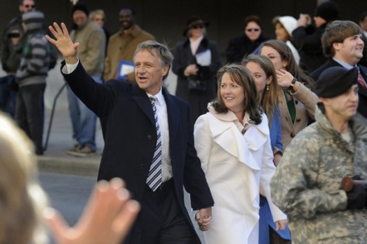 Tennessee Gov. Bill Haslam waves to the crowd as he walks the inaugural parade with his wife, Crissy, and daughters Leigh and Annie, with son William, far right, on Saturday in Nashville.