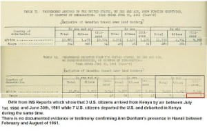 The previous year’s INS report shows that no other Certificates of Derived Citizenry by birth were issued to anyone arriving from the Kenyan region of Africa between July 1st, 1960 and June 30th, 1961. During this time, the INS recorded 282 alien arrivals from Kenya by air, and three U.S. citizens.