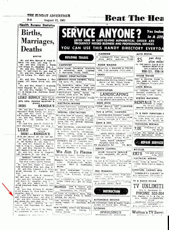 There were an average of 48 birth registrations per day in the state of Hawaii in 1961. That extrapolates to about 338 registrations per week. The Hawaiian Health Department issued a birth list to the newpapers for printing announcements in the papers’ “Bureau of Vital Statistics” section. However, the newspaper editors did not investigate the circumstances of the registered births on the list, they simply printed the information as they were given it by the Department of Health.