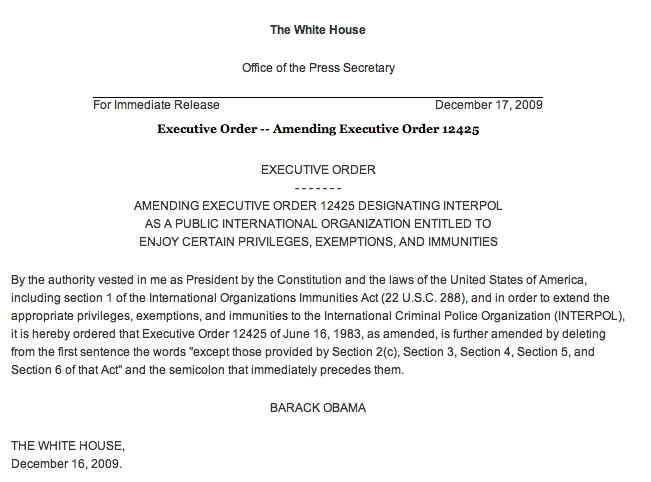 Obama’s Executive Order 12425 for INTERPOL full immunity in US Soil