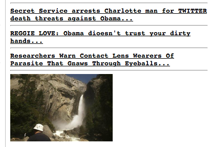 Think about it. He could have run any picture he wanted for Yosemite…like trees, or a cabin, or a map…and he could have positioned these stories in any order on the site…but they sort of tell a story when you read them horizontally like this. It’s a little game Matt Drudge is playing with people who read him often enough]