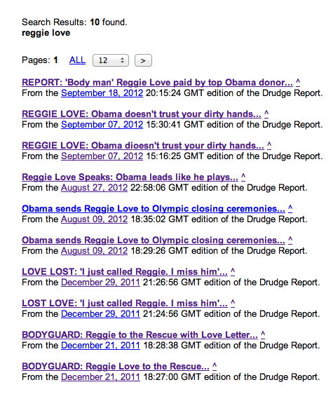 Here’s some of the innuendo that Drudge Report has run on Obama and Reggie Love while linking stories that feature Love. The key is to look at the stories that are posted around the one with Reggie Love and Obama in them; there will be a picture or words in the other stories that make a joke about Obama and Reggie Love being gay lovers and its up to Drudge’s readers to pick up on the innuendo. Like this: