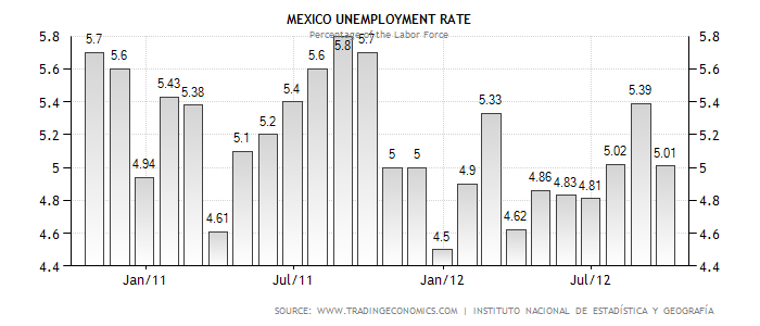 Mexico Unemployment Rate was recorded at 5.01 in September of 2012. Historically, from 2000 until 2012, Mexico Unemployment Rate averaged 3.67 Percent reaching an all time high of 5.93 Percent in May of 2009 and a record low of 2.22 Percent in November of 2002.