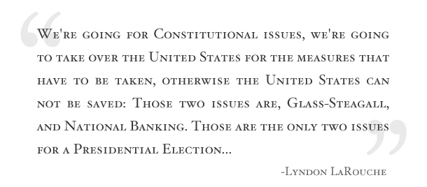 In order to accomplish the implementation of these two core constitutional policies, there must first be a bipartisan unity of leadership which expresses these non-optional, constitutional policies. So, beginning with the first in a series of dialogues aired on January 9th, Lyndon LaRouche and the federal slate of six candidates launched a process of replacing those bad habits in thinking, which have guided the nation to the brink of disaster, with the principles that can bring the best of all parties together. Once our citizens demand that these two policies, Glass-Steagall and a Federal Credit system, represent our national economic salvation, only then will a viable candidate for president emerge.