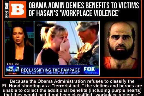 Rather than admitting that Nidal Hasan, who had exchanged more than 20 emails with [CIA’s] Al-Qaeda recruiter Anwar al-Awlaki, was engaged in terrorism, the military labeled the attack “workplace violence.”