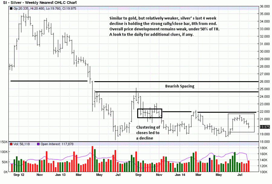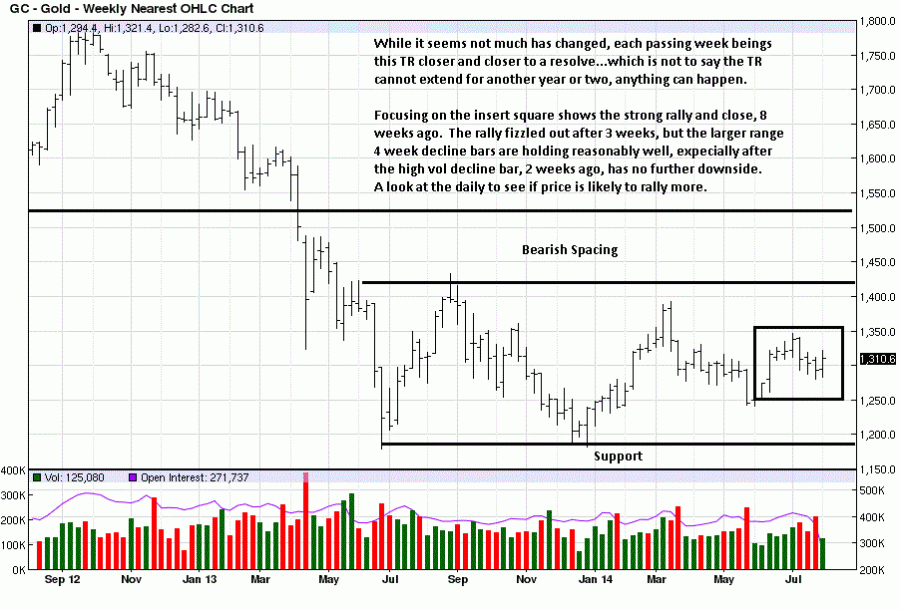 What is important to watch for next is how price reacts from Friday’s high. If the market is to continue to rally, the next correction should have smaller ranges to the downside on a lessening in volume. This will tell us the selling is weak. As the daily chart stands, it is not giving any clear sign of market strength. That could change next week, but until the change occurs, gold will continue to struggle.