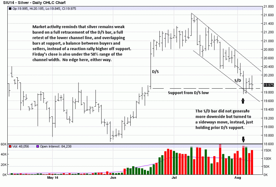 Gold had its strongest rally since the July swing high, but the read of Friday’s bar activity suggests sellers won the battle that day. It has not worked to buy high for breakouts in gold, so one must be more select when working the buy side.