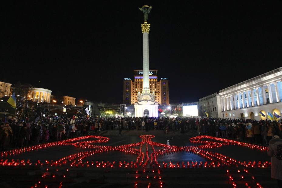 At the memorial event, Ukraine’s President Petro Poroshenko was quickly surrounded by elderly women who said their sons were among the dead in the clashes that ousted the Russian-allied government.