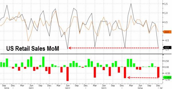 Shouldn’t this great weather, “fabulous” plunge in the unemployment rate, and billions of dollars put back into pockets by collapsing gas prices, have spurred an awesome retail sales surge this year? The Wall Street shysters drove the stock market to record highs in December based on this false storyline. The decline in real wages in November revealed the falsehood of the jobs recovery. Any savings from lower gas prices is being used to pay down credit card debt and pay for the dramatically higher healthcare costs caused by Obamacare.