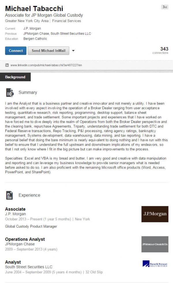 As his LinkedIn profile below shows, Tabacchi was an associate for JPMorgan in its global custody product unit.
