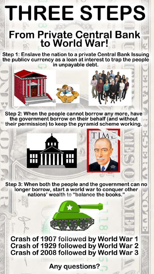 So off to war your children must go, to spill their blood for the money-junkies’ gold. We barely survived the last two world wars. In the nuclear/bioweapon age, are the private central bankers willing to risk incinerating the whole planet just to feed their greed?