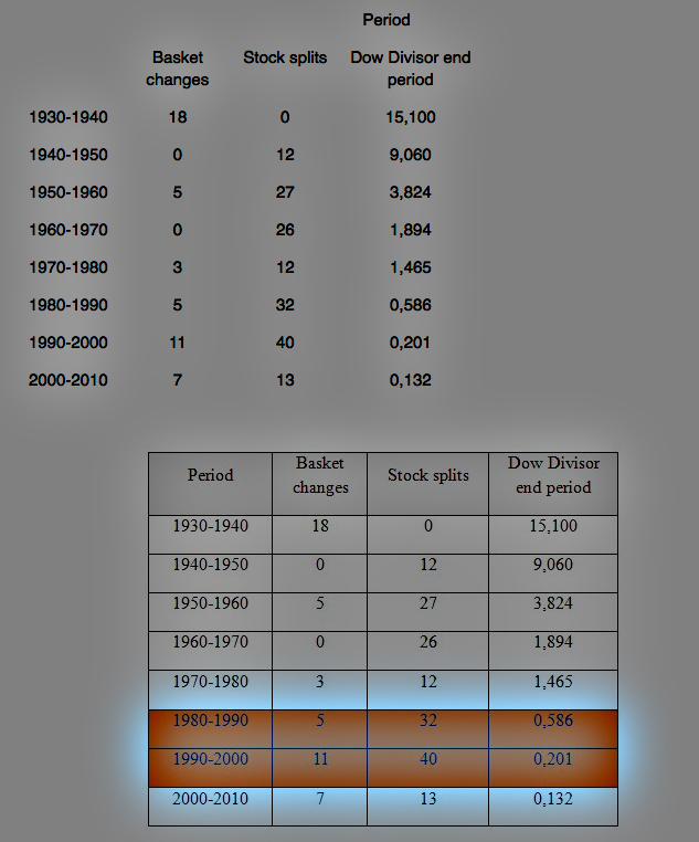 Table 1. Changes in the Dow, stock splits and the value of the Dow Divisor after the market crash of 1929