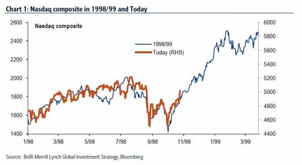 Last night, when laying out Bank of America’s case on how much higher this “one final meltup” can push Wall Street, we observed a topic that has gained particular prevalence in recent weeks: following the latest snapback from its September lows, instead of comparisons to 2007, the latest fad is to compare equity index chart to those in late 1998, early 1999 in the aftermath of the LTCM bailout, and just before the dot com bubble took off in earnest.