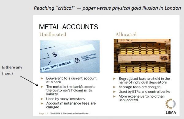 The convention of trading unallocated [paper] gold has been based on a fractional reserve system [Keynesianism]. It works as long as gold buyers retain confidence that the banks could deliver physical gold if demanded, but our analysis suggests that they could not.