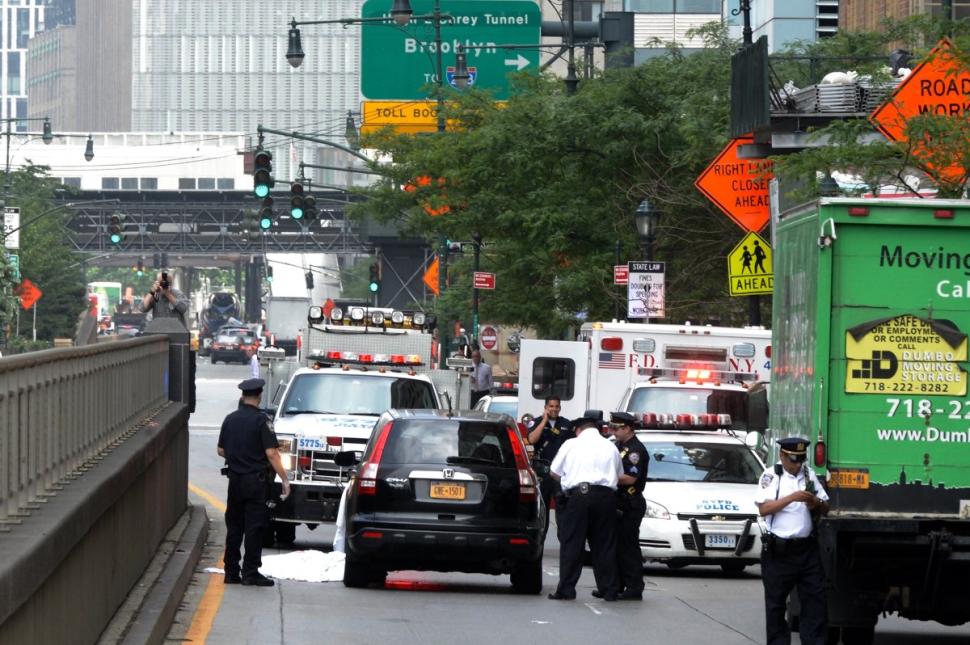 Hours after the apparent suicide, the man remained unidentified. Body parts were found under the CRV, witnesses said. Blood was found pooled under the car and spattered on both sides of the railing, witnesses said. “He’s a mess,” a police source said. “His face is barely decipherable.”