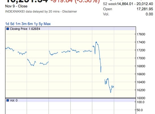 The benchmark Nikkei 225 index lost in excess of 900 points, closing the session at 16,251.54
