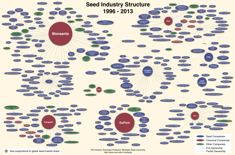 Michigan State University produced a graphic representation of the seed and chemical companies’ size and company ownership that visually demonstrates the sheer size and reach of Monsanto.