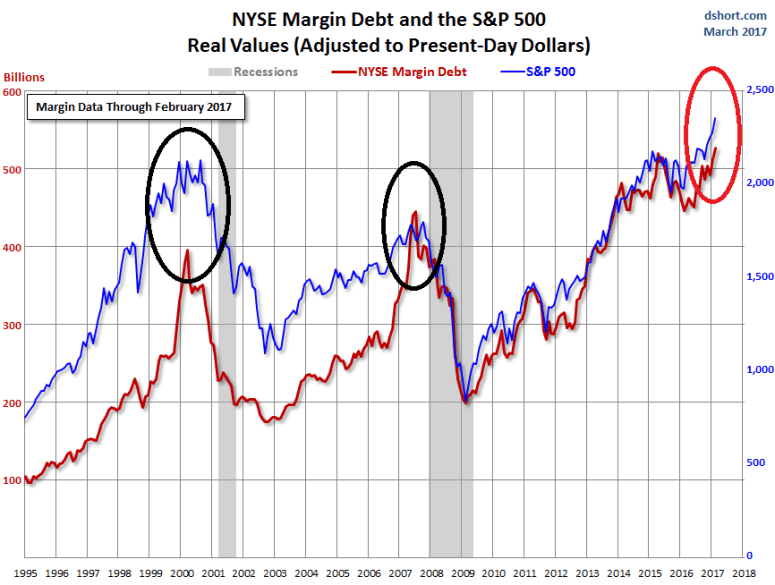 Margin debt looks dangerously high, similar to conditions before the 2000 crash and 2008 crash.