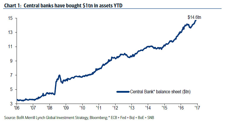 Central Bank Balance Sheets have increased by $10 trillion in the last decade and $1 trillion YTD in 2017.