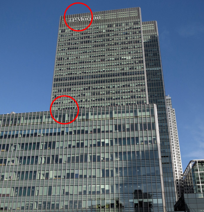 The offices of JP Morgan in the Canary Wharf district of London, January 28, 2014. Police said they are investigating the “non-suspicious” death of a man who fell onto a ninth floor roof at the European headquarters of investment bank JP Morgan in London’s Canary Wharf on Tuesday morning. REUTERS/Simon Newman (BRITAIN – Tags: BUSINESS) – RTX17Y9Y