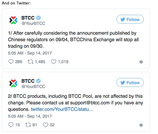 In a statement released on Weibo, BTC China said that it would immediately stops accepting new account registrations on BTCChina Exchange. The decision was made after “carefully considering” Chinese regulatory bodies’ Sept. 4 announcement on preventing risks associated with token fundraising. A google-translated version of the statement: