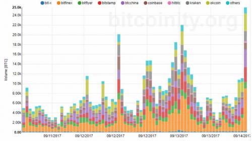 Also notable: as of this moment, China-denominated bitcoin is trading at about 17,000 yuan or just under US$2,500, indicating there is a nearly 30% arb between Chinese and offshore trading.