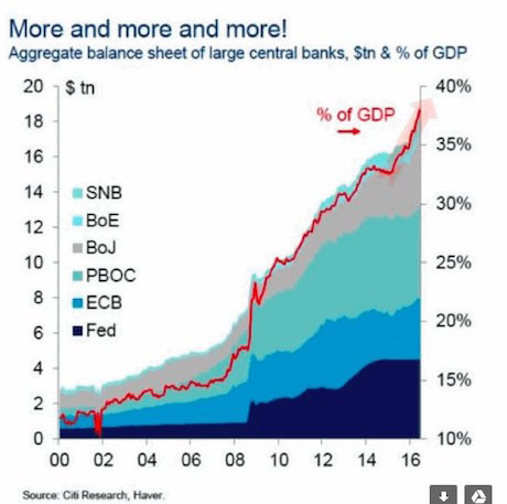 Put another way, the economies of the EU, Japan, and the US are all growing rather than contracting… but Central Banks are printing MORE money today than they were during the depths of the last systemic crisis (the EU crisis of 2012-2013).