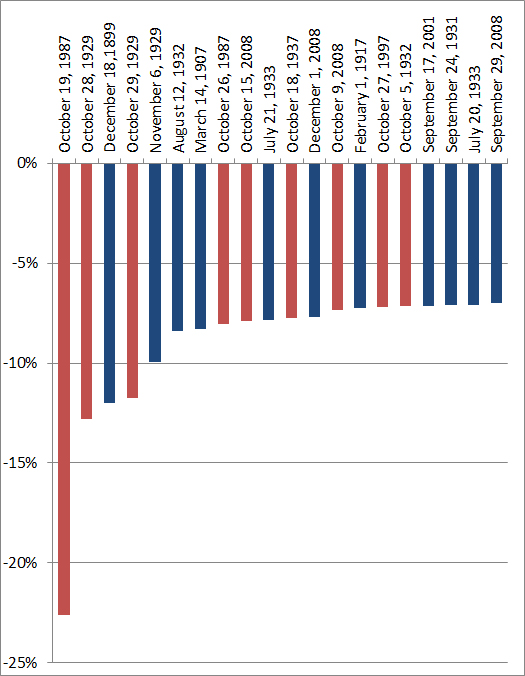 Let as examine these extreme market moves more closely. The following chart shows the 20 largest one-day declines in the Dow Jones Industrial Average. Crashes that occurred in October are highlighted in red.