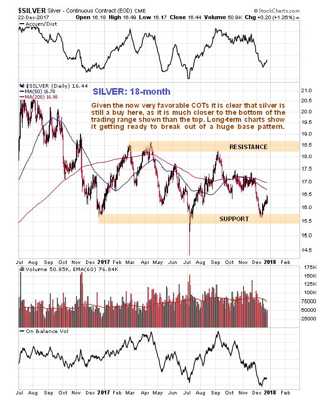 On the 6-month silver chart we can see the breakdown from a Symmetrical triangle that occurred late in November leading to a drop well into December, and also how silver has slowly recovered over the past two weeks. In itself this chart looks bearish, with a breakdown followed by a rally back up towards resistance, and moving averages in unfavorable alignment, and it is only when we consider the latest COTs and then look at long-term charts that we realize that the setup is a lot more bullish than it looks at first sight on this 6-month chart.
