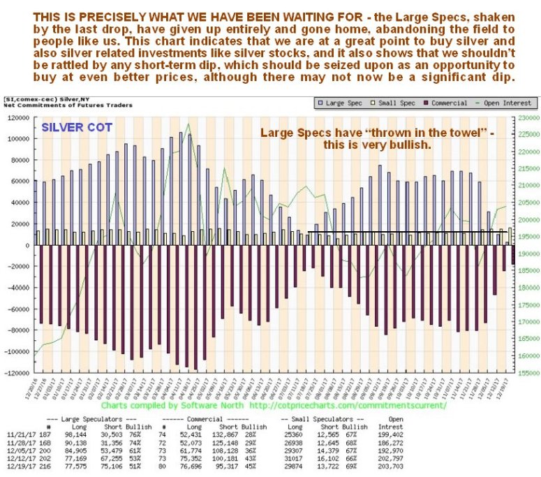For many weeks we have been waiting patiently, like vultures perched on the branches of trees, for the Large Specs to go belly up and croak, and the good news is that they just have, so it’s time for us to swoop down and feast on the carcasses, the carcasses being silver and the better silver stocks, which are at good prices here, and although they have already started rallying over the past week or two, the COT structure is now much healthier, suggesting that they will continue to advance.
