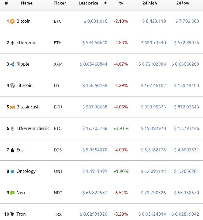 Meanwhile, the price of one bitcoin token (BTC) hovered at $8,031 as of this writing, down 2.18% from 24 hours earlier. Not surprisingly, the prices for 8 of the top 10 most valuable cryptocurrencies all cratered since yesterday.