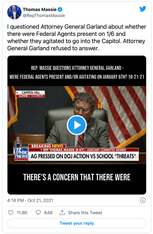 Rep. Massie: I was hoping today to give you an opportunity to put to rest the concerns that people have that there were federal agents or assets of the federal government present on January 5 and January 6. Can you tell us, without talking about particular incidents or particular videos, how many agents or assets of the federal government were present on January 6, whether they agitated to go into the Capitol, and if any of them did?