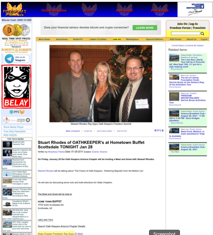And lo and below, Ray Epps and Oath Keepers kingpin Stewart Rhodes are old pals in the organization. In fact, Stewart Rhodes was Ray Epps’s old boss. Back in 2011-2012, Epps was the Arizona state chapter leader of the Oath Keepers — the biggest Oath Keepers chapter in the country — while Rhodes was and remains the national leader. (See, e.g., archived proof of Epps as Arizona Oath Keeper President here, here and here.) Reason Magazine’s Radley Balko even interviewed Ray Epps while Epps was running the Arizona Oath Keepers a decade ago: