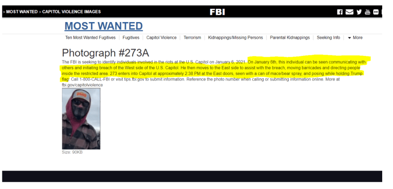 On January 6th, this individual can be seen communicating with others and initiating breach of the West side of the U.S. Capitol. He then moves to the East side to assist with the breach, moving barricades and directing people inside the restricted area. 273 enters into Capitol at approximately 2:38 PM at the East doors, seen with a can of mace/bear spray, and posing while holding Trump flag. Call 1-800-CALL-FBI or visit tips.fbi.gov to submit information.