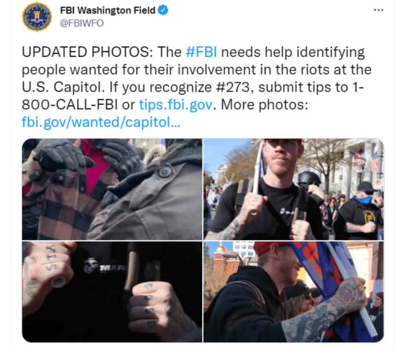 The FBI “Wanted” page for him has several big fat full face shots, maskless, complete with unmistakably unique knuckle tattoos, as well as two full tattoo sleeves.