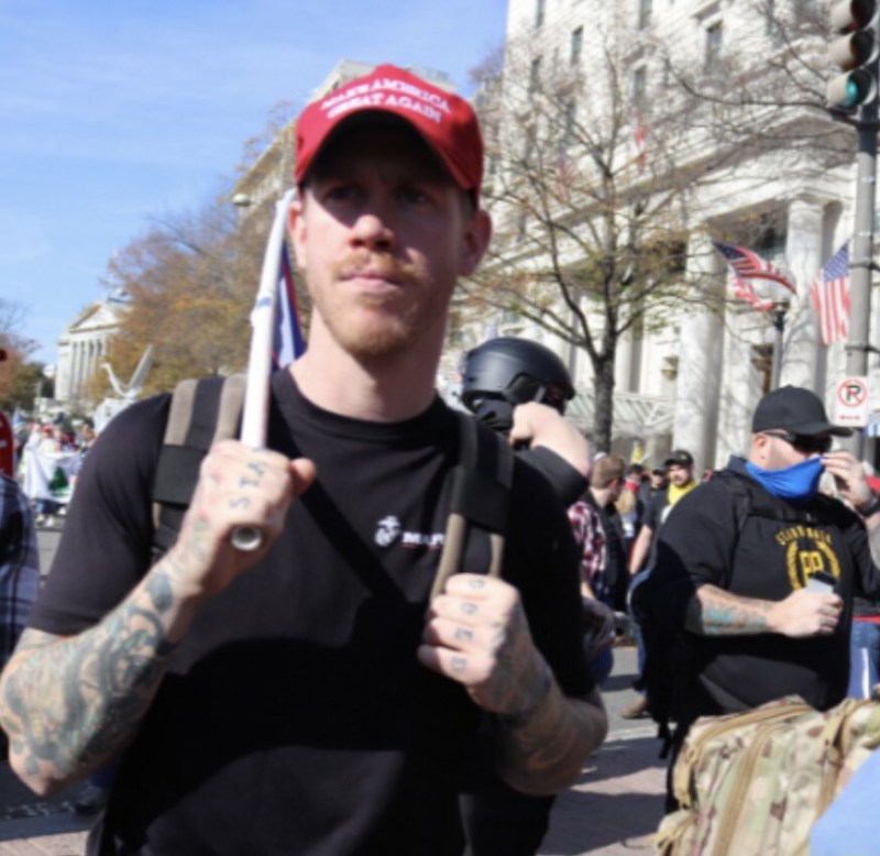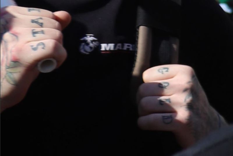 You can literally read his knuckle tattoos. That’s how HD and pristine these photos are. That shirt says “Marines” by the way, just like Ray Epps, and just like Ryan Samsel (discussed below).