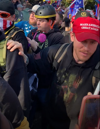 This second sentence — “the first barrier, which, he later learned, was taken down by one of his Proud Boys acquaintances and a young woman with him” — appears to be a direct reference to Ryan Samsel (#WhiteHoodie) and his girlfriend, Raechel Genco, also known as #WhiteHoodieGF — as Samsel took down “the first barrier” with his girlfriend at his side.