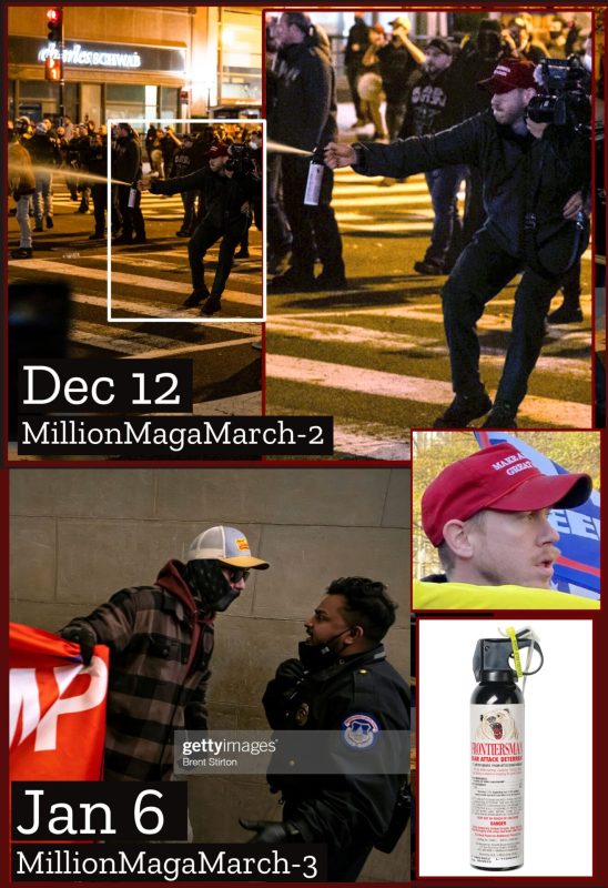 But here is MaroonPB with an actual can of actual Frontiersman bear spray, spraying an actual plume at the December 12 MAGA march, as well as him with bear spray again on January 6: