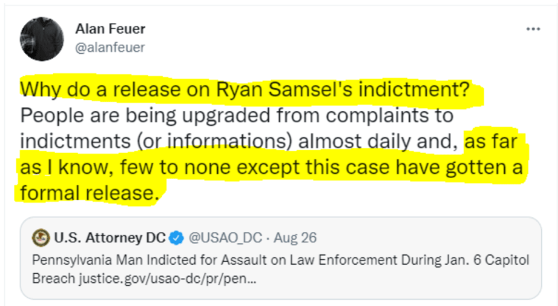 On top of it, Samsel’s legal scalp has been hoisted for ceremonial victory parades by the Justice Department. Even the typically prosecution-maximalist New York Times reporter Alan Feuer appeared confused as to why the Justice Department so theatrically singled out Samsel for a special press release simply for upgrading his charges in April: