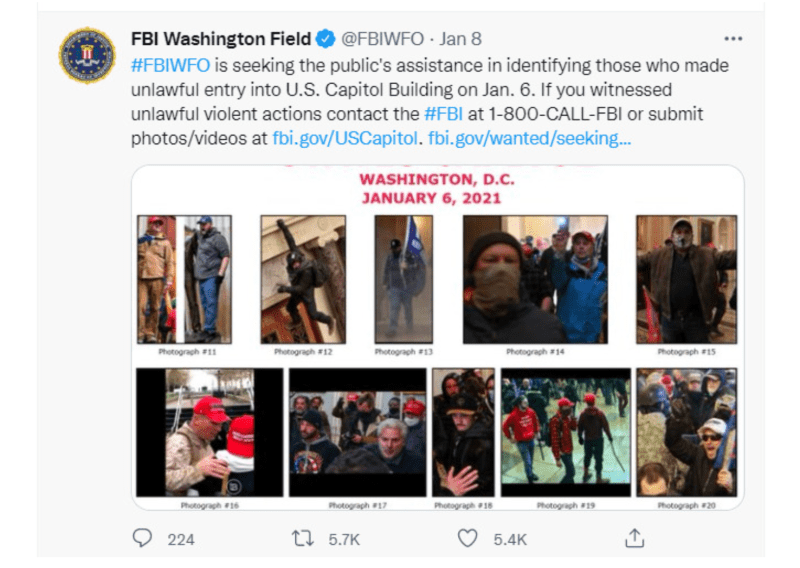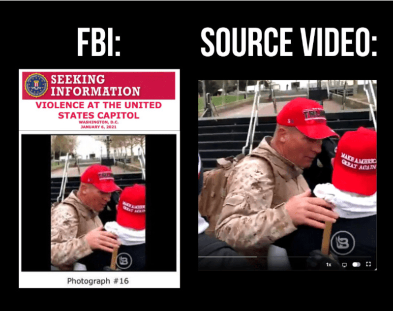 By January 8, the FBI Capitol Violence Most Wanted List featured a big fat friendly face shot of Ray Epps. The FBI’s Washington Field Office, in a tweet the same day, called for the public’s help in identifying Epps. Epps, dressed in full camo with a bright red “Trump” hat, is the FBI’s “Suspect 16” in the bottom-left quadrant of both images reproduced below: