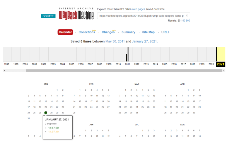 The Wayback Machine’s automatic archiving process suggests Stewart Rhodes’s OathKeepers.org posts concerning Ray Epps were effectively dormant from 2011 until 2021. Then, at approximately 3 p.m. on January 27, 2021, there is an update showing the page had been 404’d.